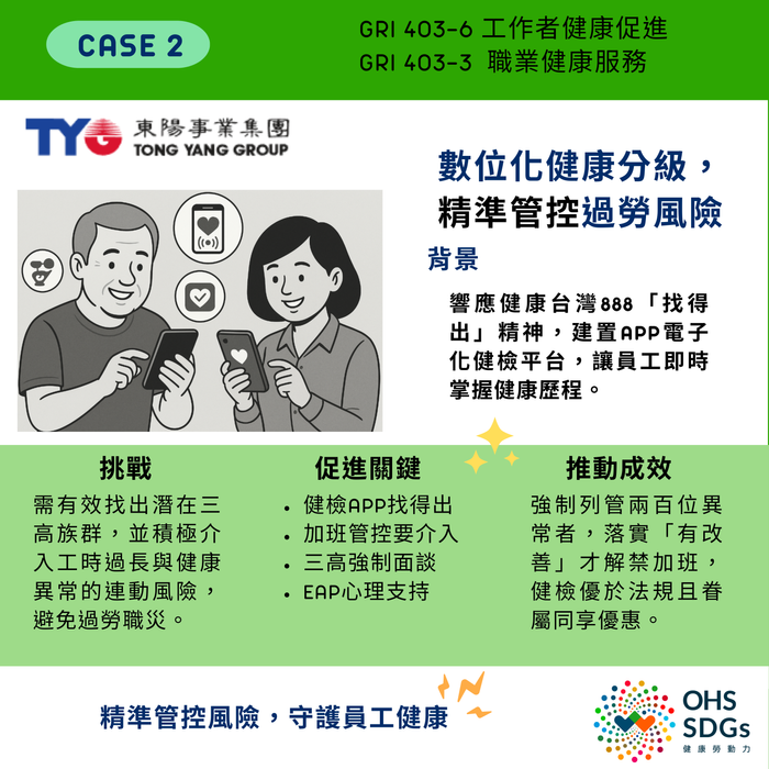 數據化管理是精準預防的基石。和勤精機透過健檢大數據分析,精確揭露低密度膽固醇與 BMI 為十大異常之首,鎖定防治目標;技嘉科技則建立「健康分級金字塔」,將員工健康風險可視化,針對第四級高風險族群啟動專案追蹤與補助,確保潛在危機無所遁形。