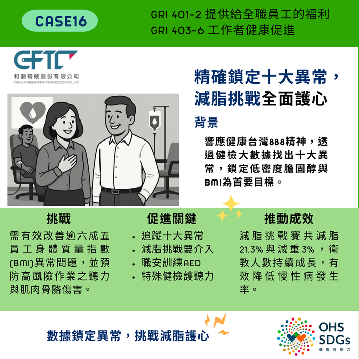 讓健康投資展現真實回報。台灣高鐵推動全員減重,累計甩肉達 2,798 公斤;台新金控號召員工健走累積 4.4 億步,成功將健康成效轉化為減碳 ESG 數據;威健實業則透過體能賽事,使全體員工體脂率平均下降 1.32%,成功逆轉代謝風險,打造真正的高績效健康職場。
