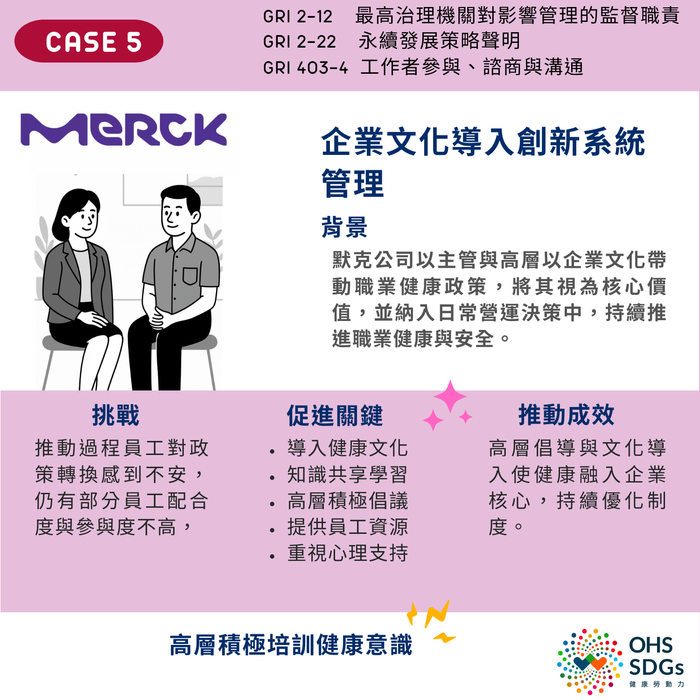 下方範例來自科技、鋼鐵、製造與傳產等領域,展現如何透過董事會議題列管、總經理年度健康簡報、主管親訪高風險場域等方式,讓健康勞動力的推動從「高層承諾」落實到「全員共識」。
